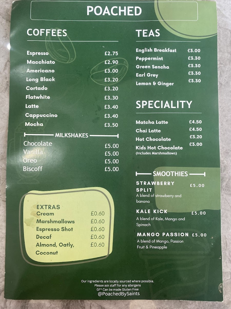 Welcome to Poached By Saints, a charming café nestled in Maidenhead. Known for its inviting atmosphere and friendly service, this spot specializes in brunch offerings that are sure to satisfy any appetite. Highlights from the menu include classic plates like Eggs, Chips & Beans and the heartier Ham, 2 Eggs & Chips. For those craving something different, their selection of mouthwatering milkshakes—including Oreo and Biscoff—are a must-try.